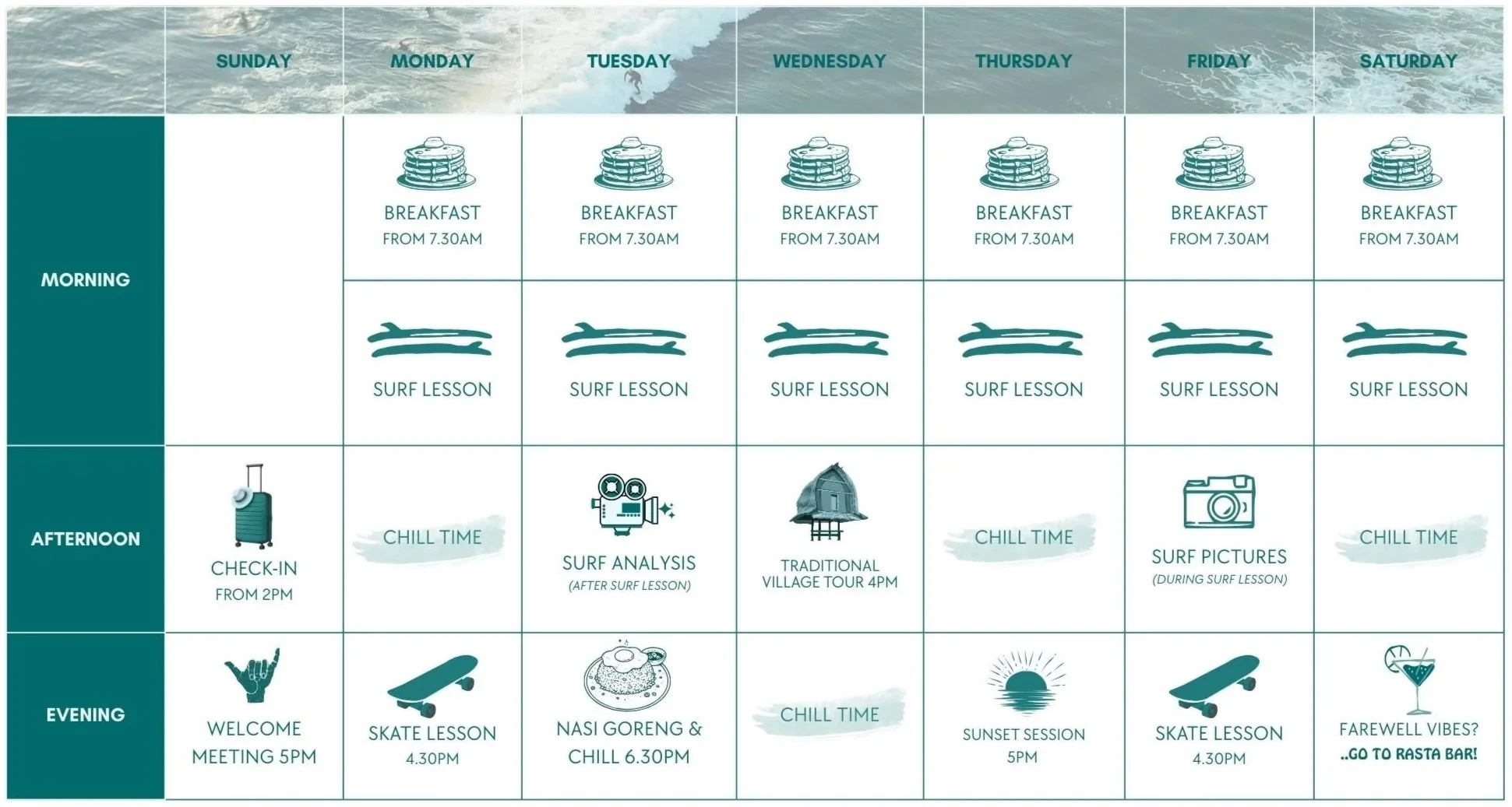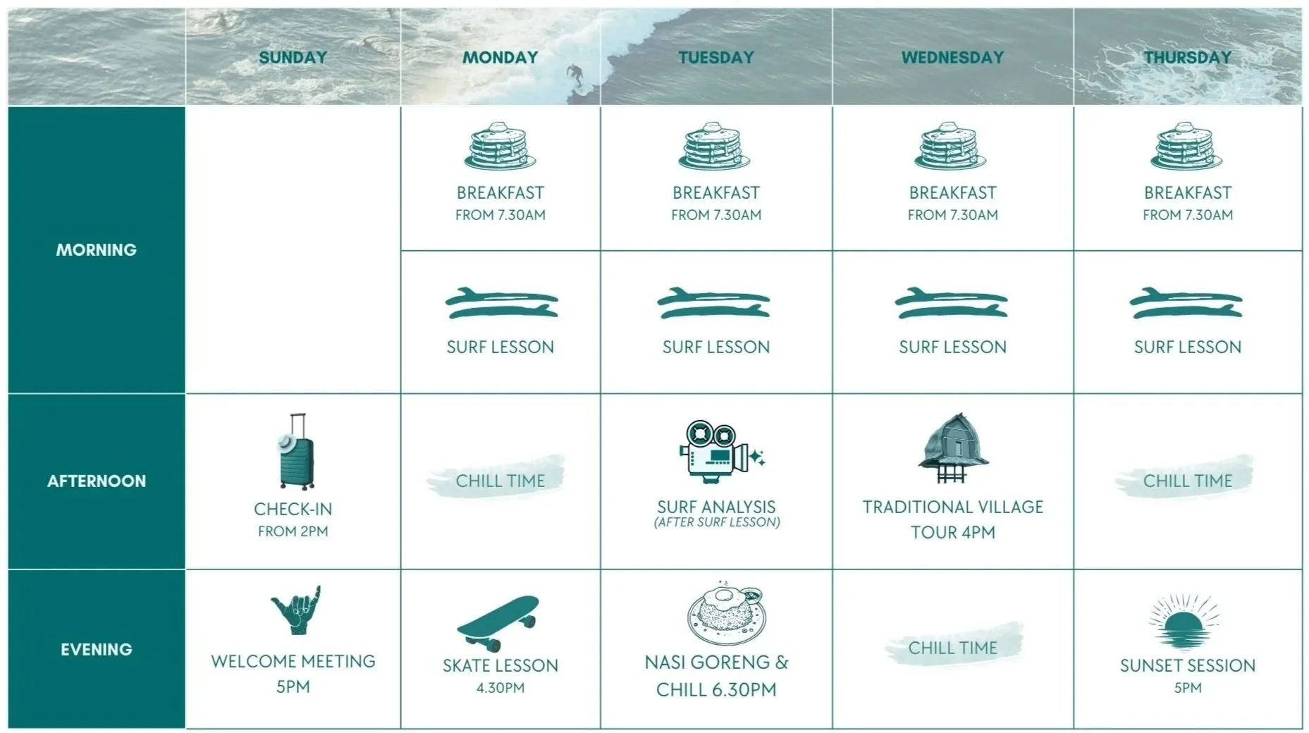 A shorter getaway — same surf spirit, less time needed.